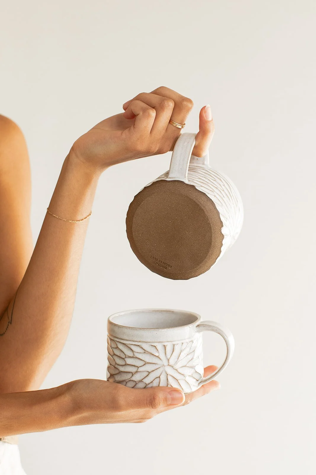 All pieces are made from stoneware clay, glazed in white, and hand carved in a floral pattern.